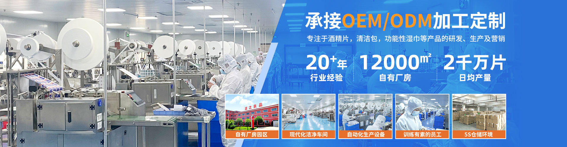 我们的优势: 1、专业化学实验室,自主研发液体配方; 2、自身制造、研发、升级全自动包装设备; 3、配有专业印刷工厂,打样及交货更加快捷方便; 4、近20年专业制造经验,有效稳定产品品质; 5、满足不同客户的交期要求,提供出口便利; 公司产品销售对象遍布美国、欧洲、日本及东南亚等世界各地。产品广泛应用于:航空、餐饮、医疗医用、电子工业、光学数码、学校、家庭、银行、休闲娱乐、个人美容护理以及其他清洁行业的特种擦拭。公司已获得江西省卫生厅颁发的卫生许可证,通过FDA、CE、SGS认证认证等相关国际认证。也为国内外知名企业代工生产。