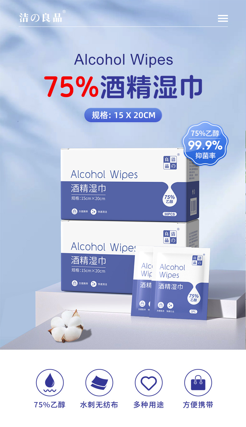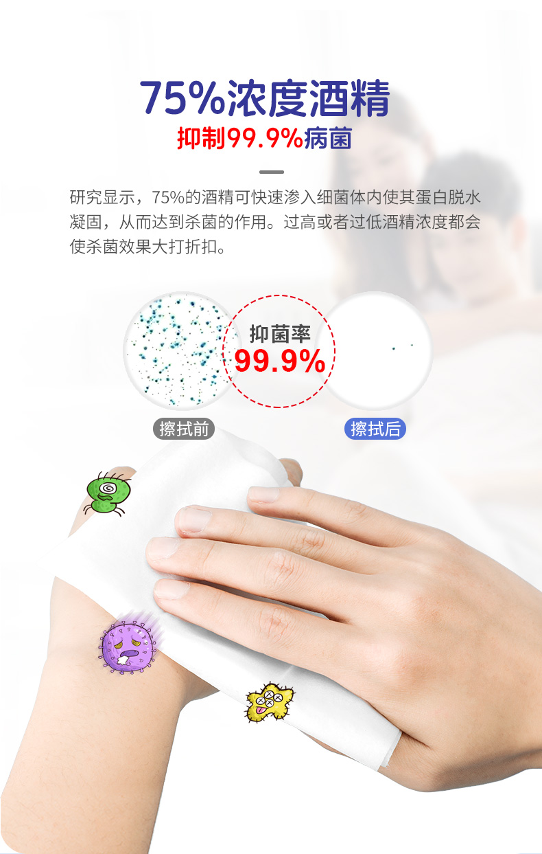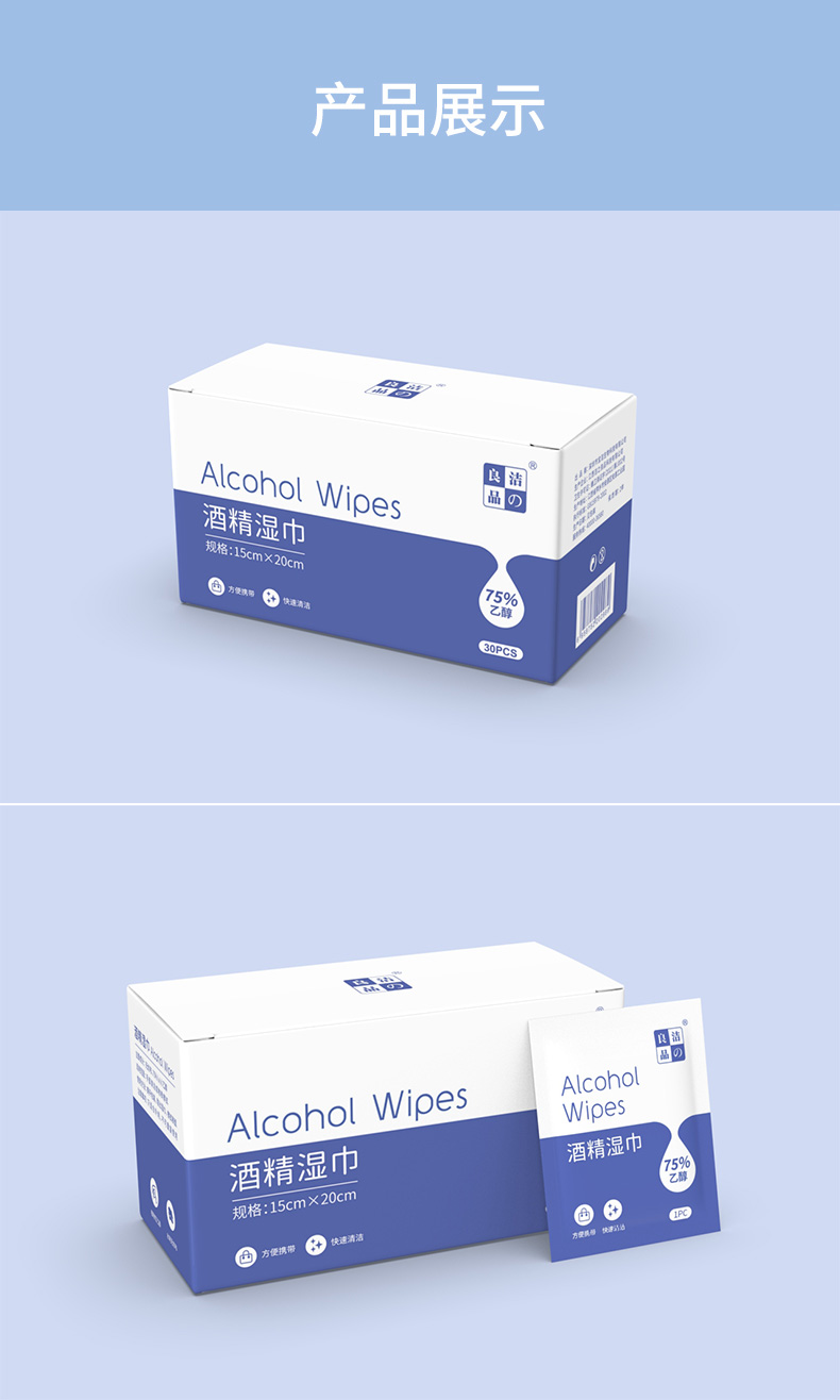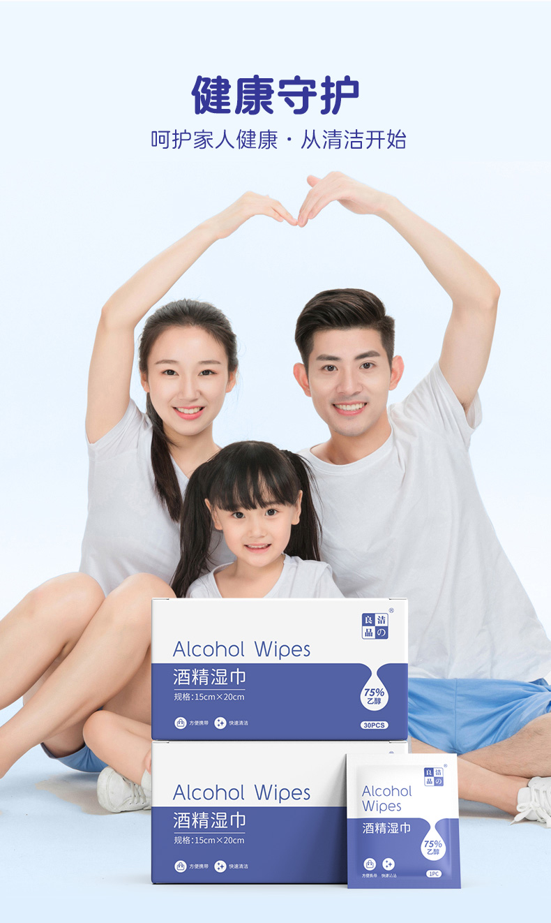 产品特点:采用柔软的无纺布制造,含70%-75%酒精。单独包装,消毒效果好,快速清洁,携带方便,广泛用于人(物)体表面的清洁和消毒。