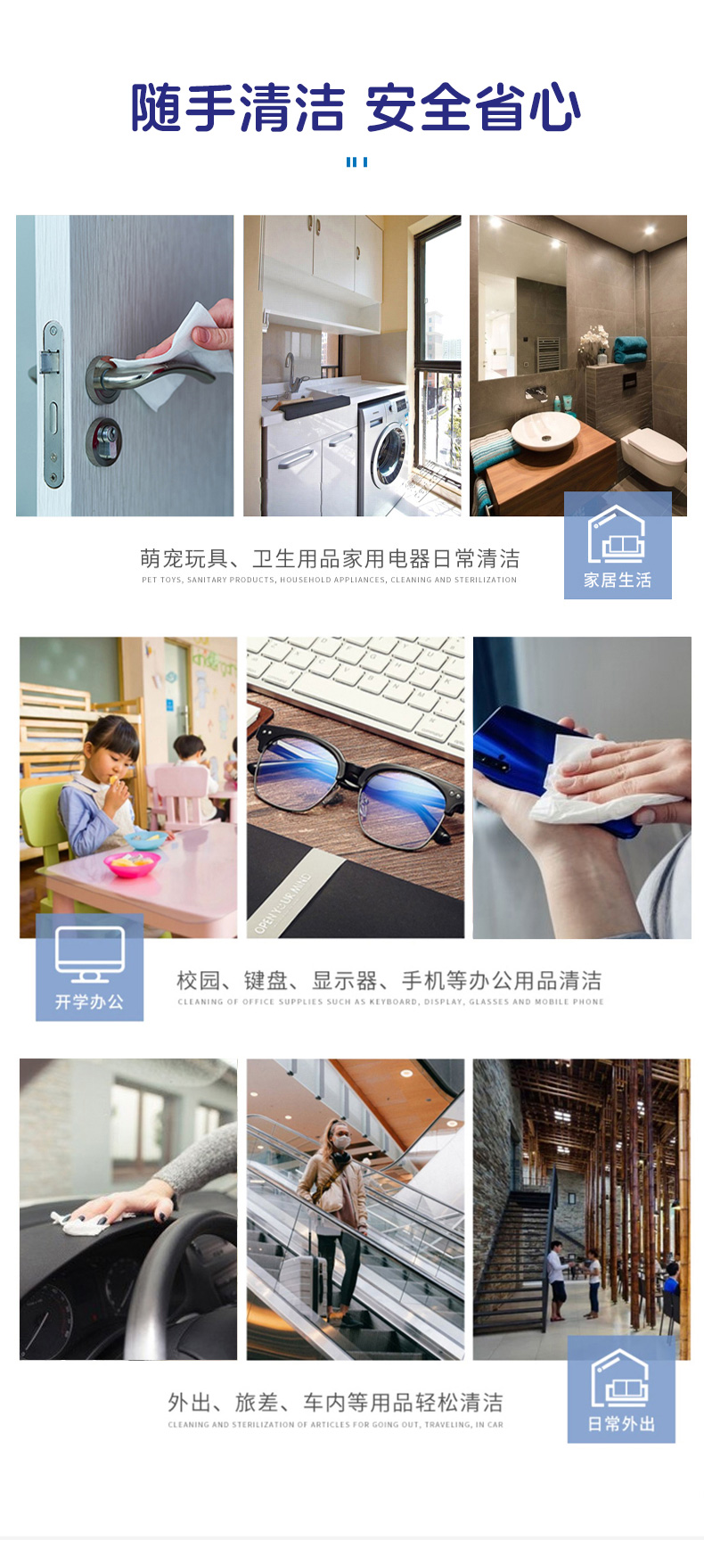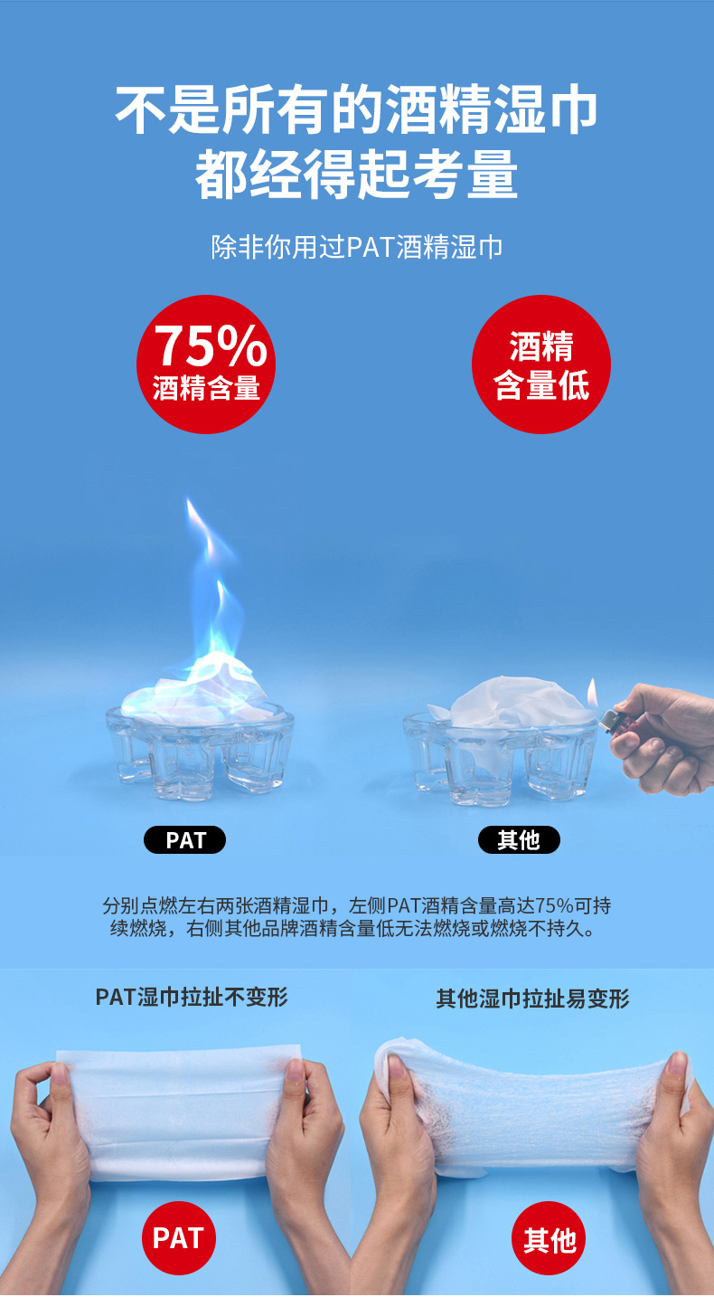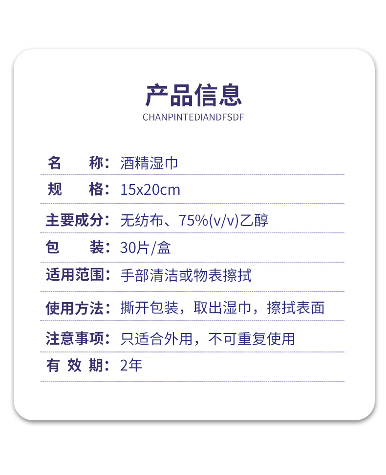 产品特点:采用柔软的无纺布制造,含70%-75%酒精。单独包装,消毒效果好,快速清洁,携带方便,广泛用于人(物)体表面的清洁和消毒。