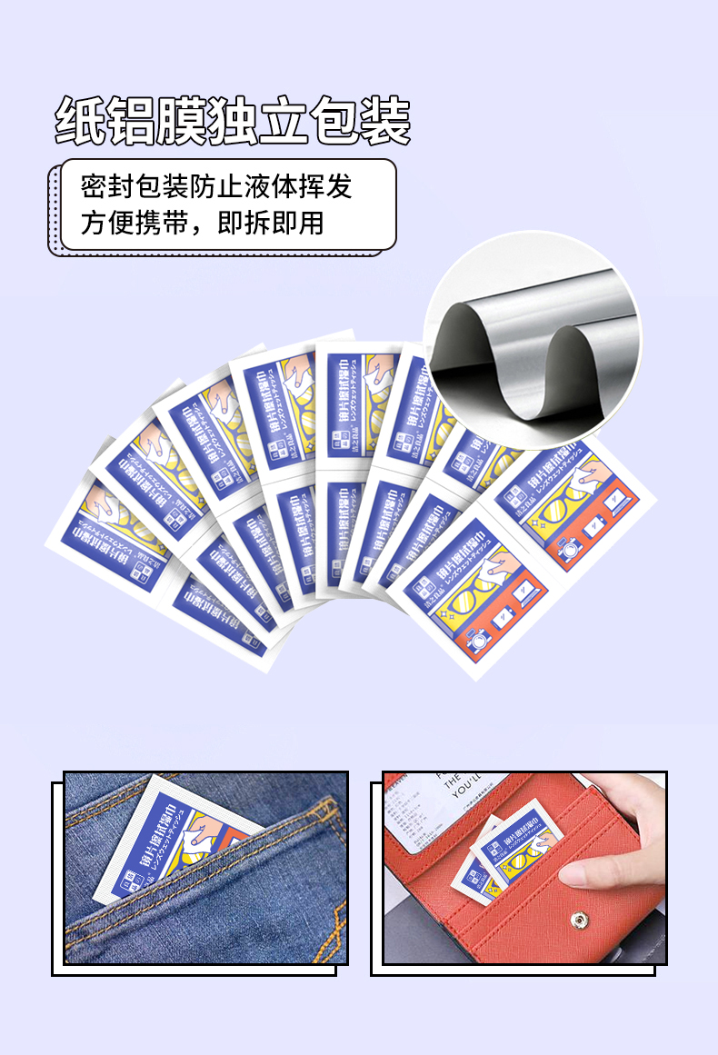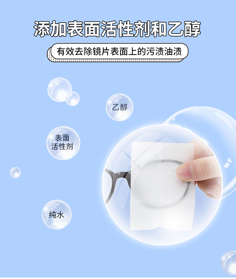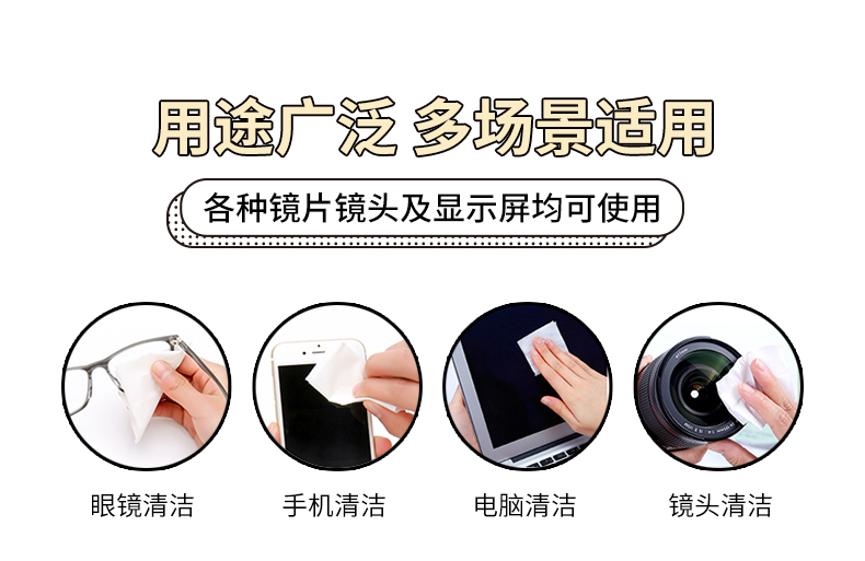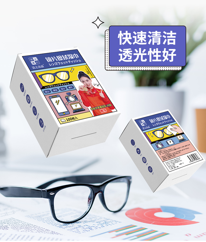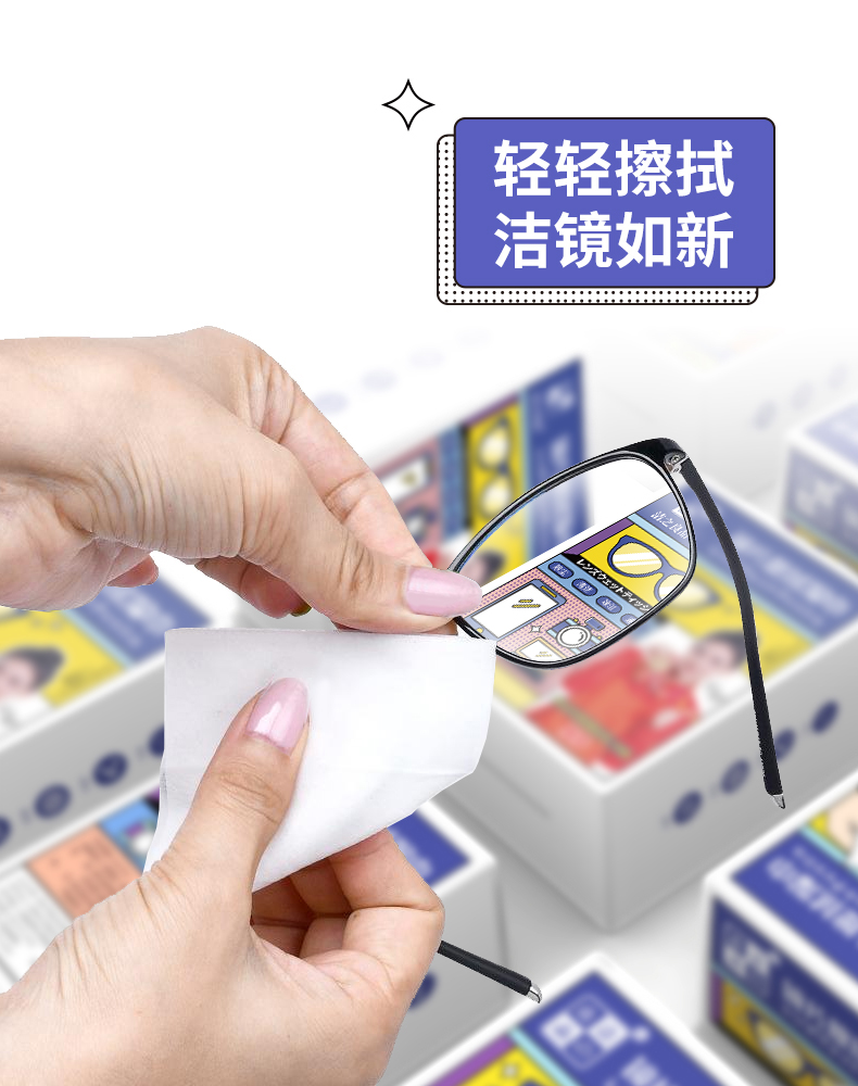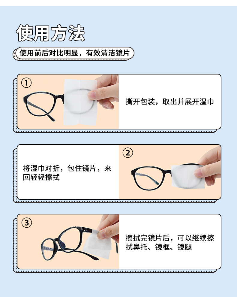 使用说明:撕开铝箔,取出湿巾,轻轻擦拭镜片直到镜片干净为止。