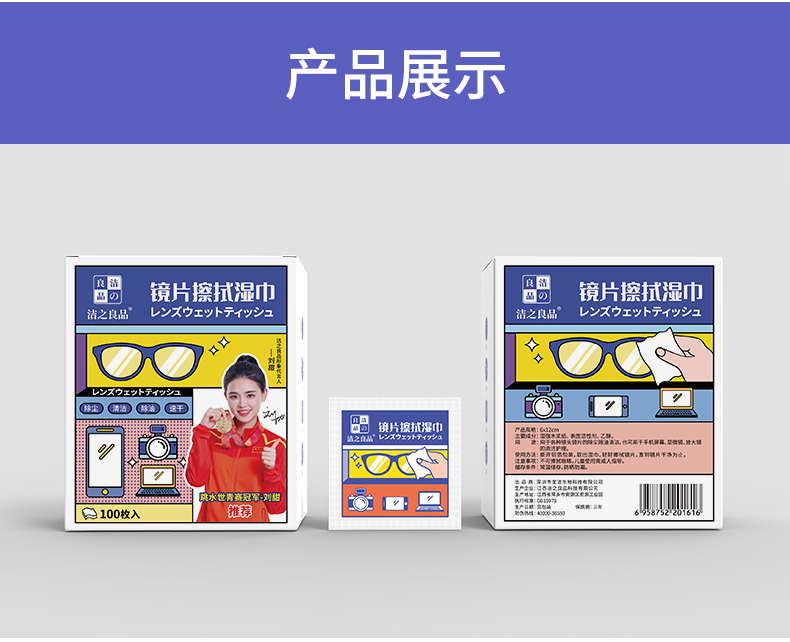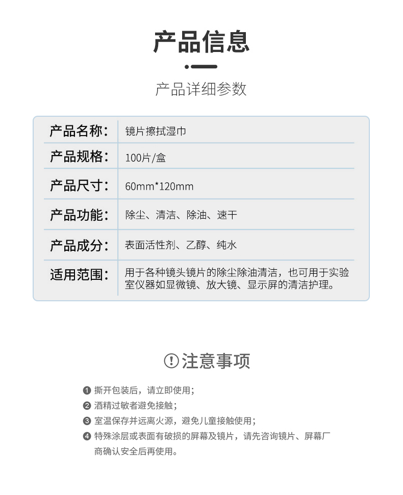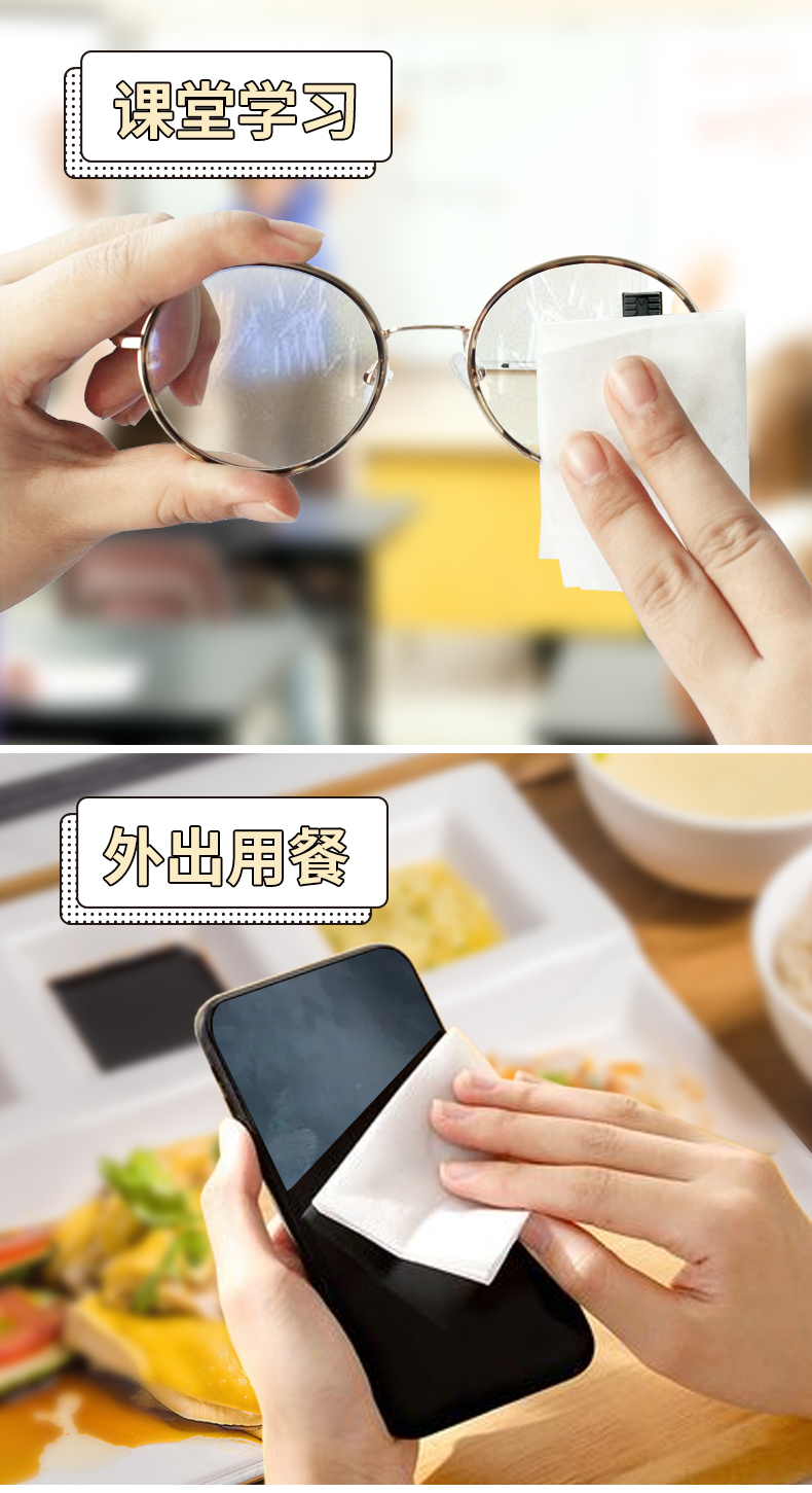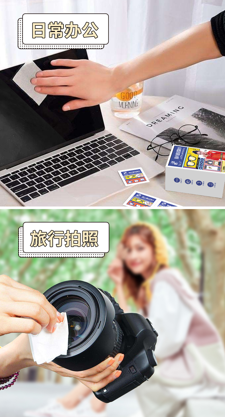 使用说明:撕开铝箔,取出湿巾,轻轻擦拭镜片直到镜片干净为止。