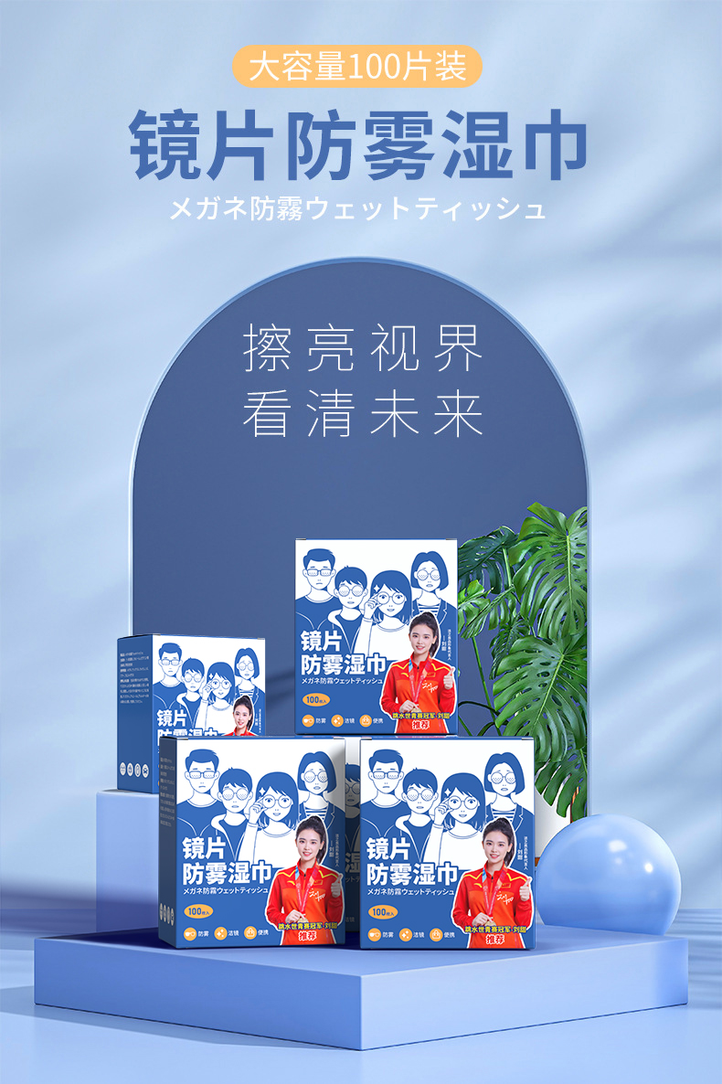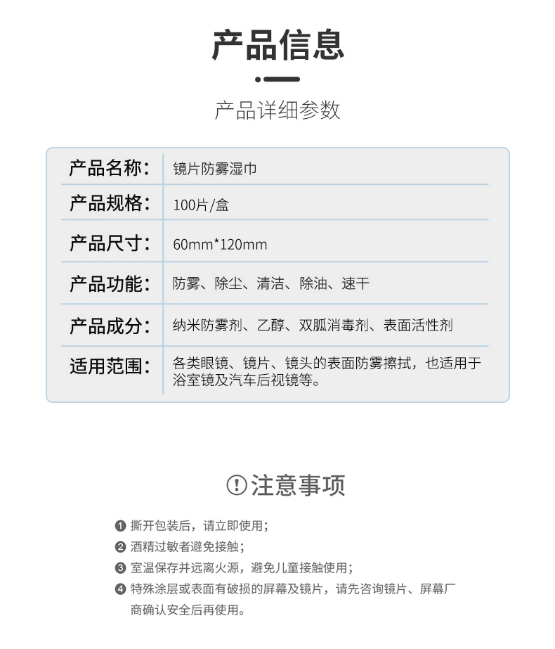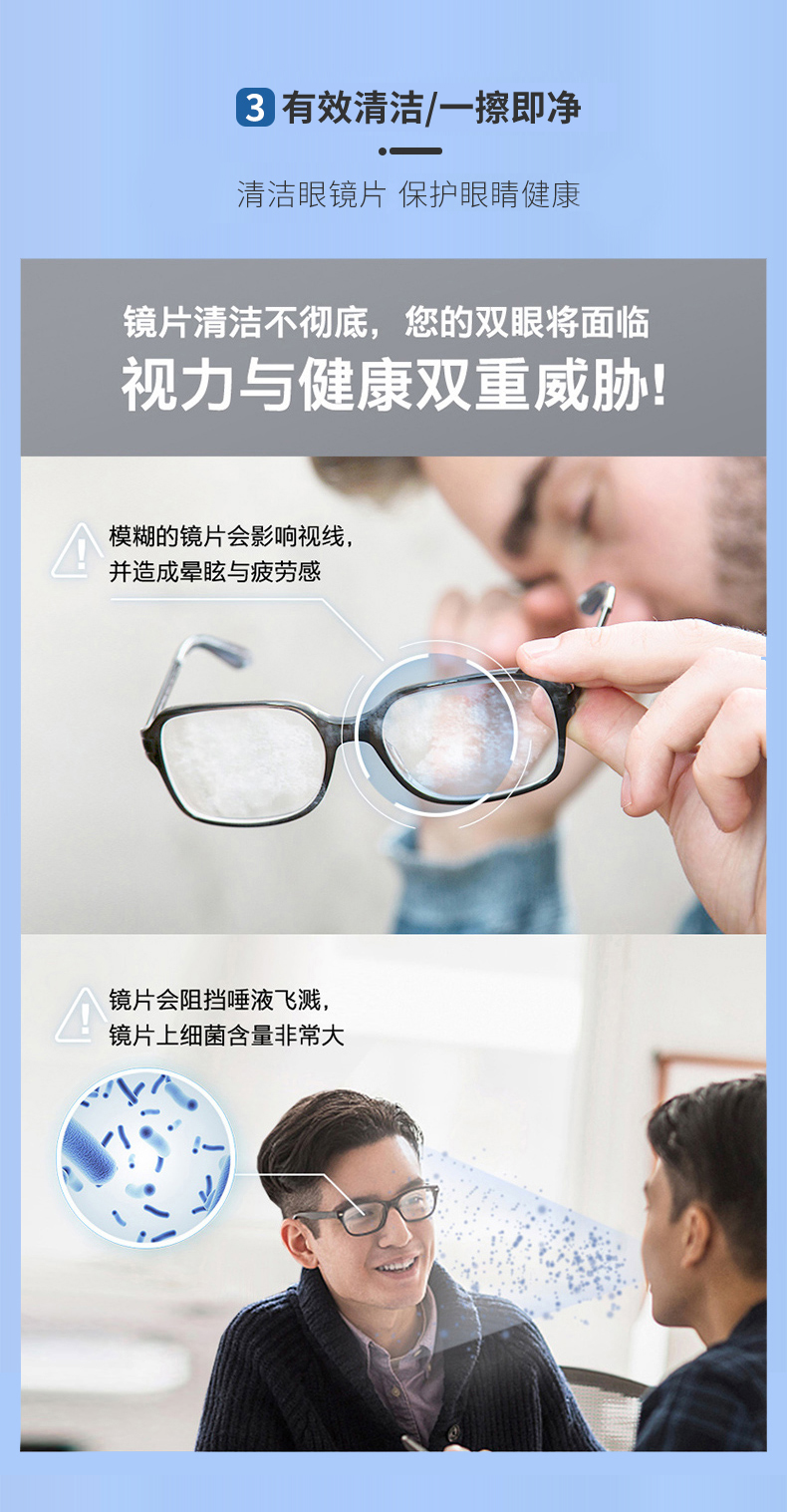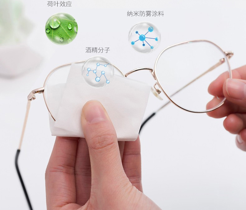 • 使用说明:撕开铝箔,取出湿巾,在镜片上朝一个方向轻轻擦拭。