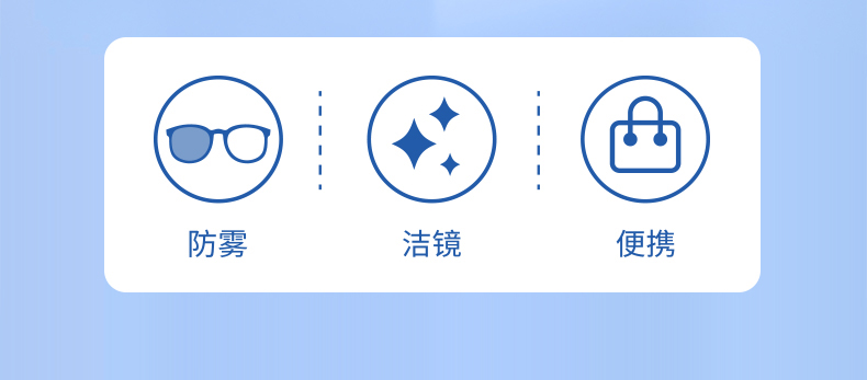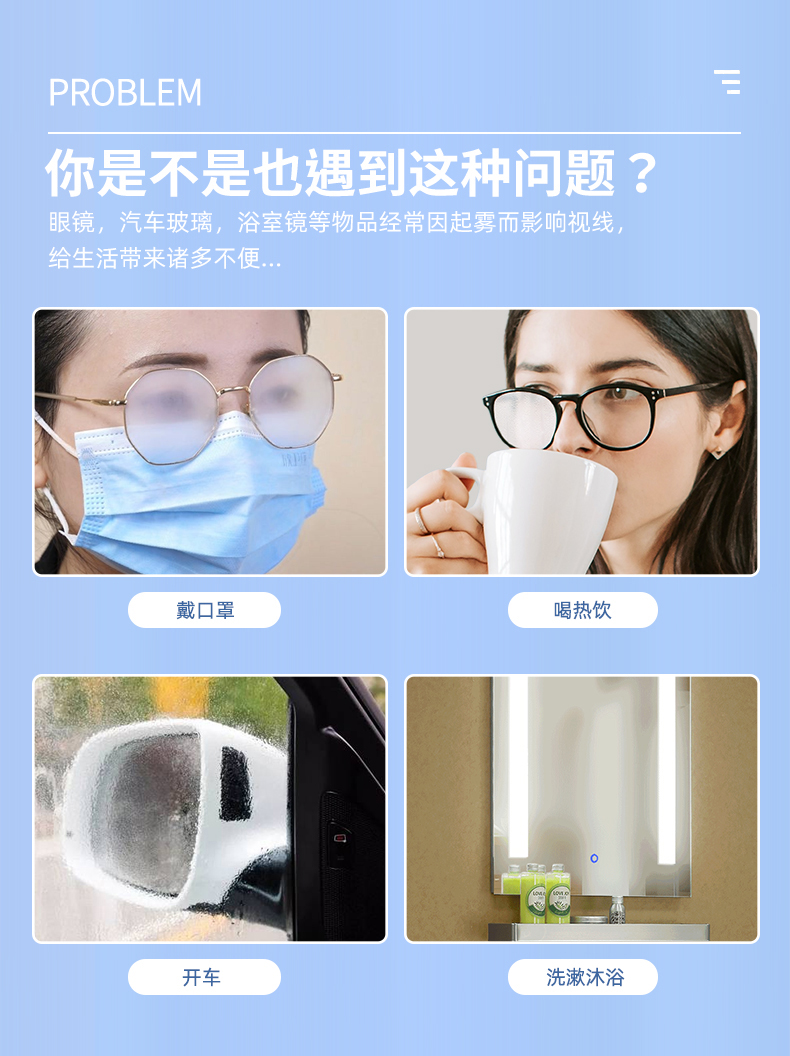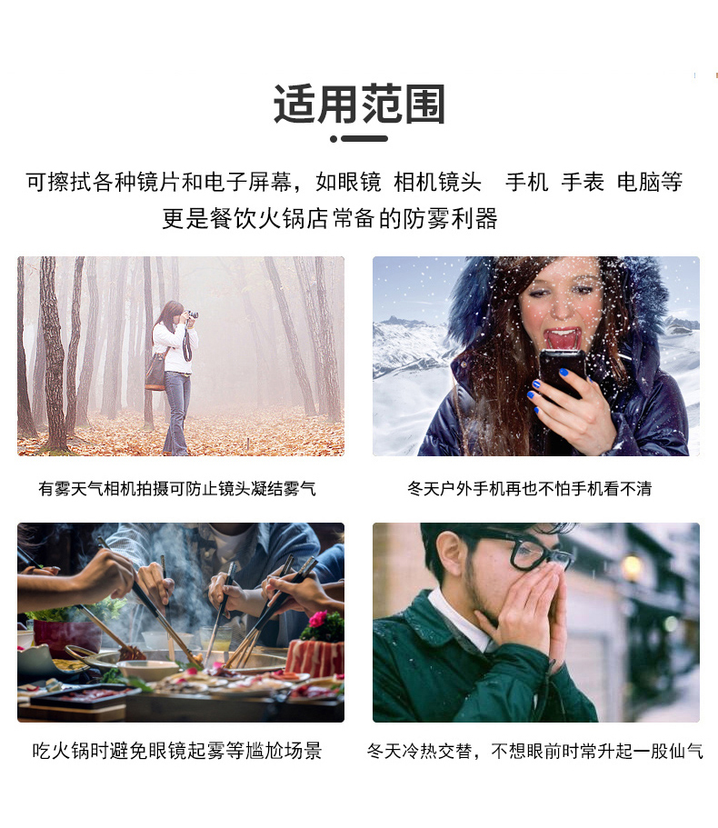 • 用 途:各类眼镜,镜片、镜头的表面防雾擦拭,也适用于浴室镜 及汽车后视镜等。