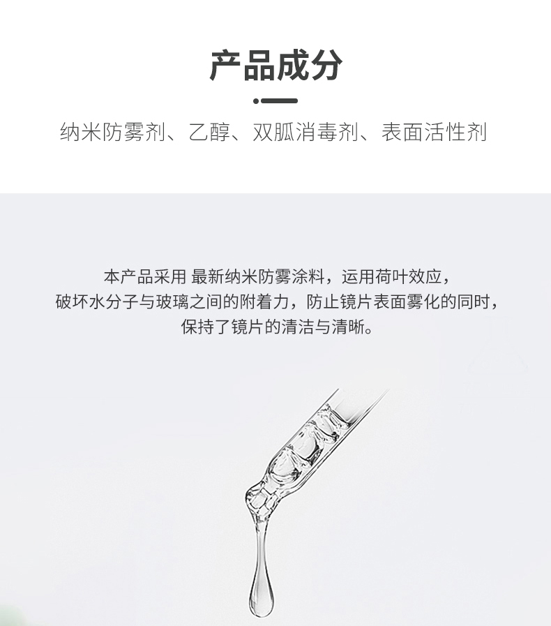 • 主要材料: 纳米防雾剂、乙醇、表面活性剂等。