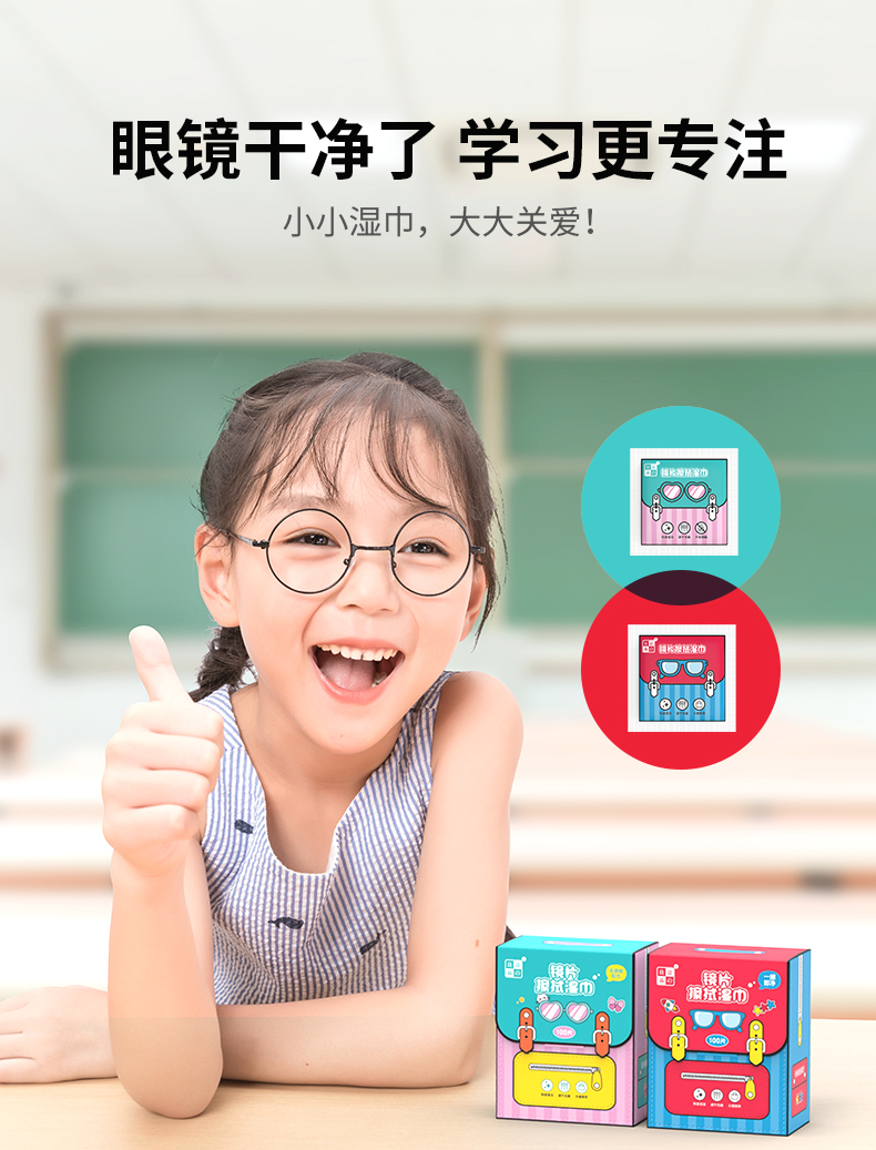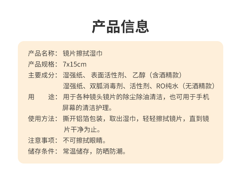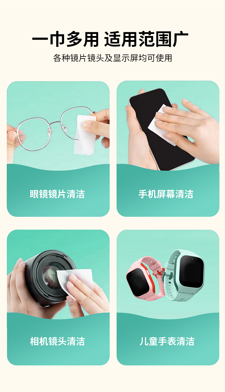 使用说明:撕开铝箔,取出湿巾,轻轻擦拭镜片直到镜片干净为止。