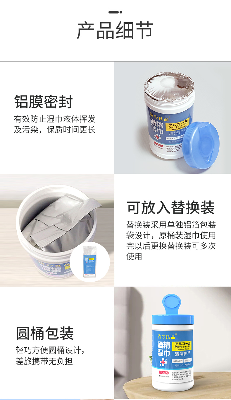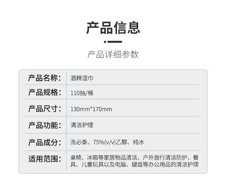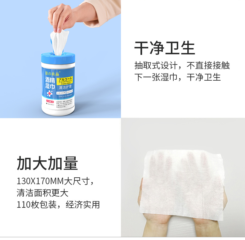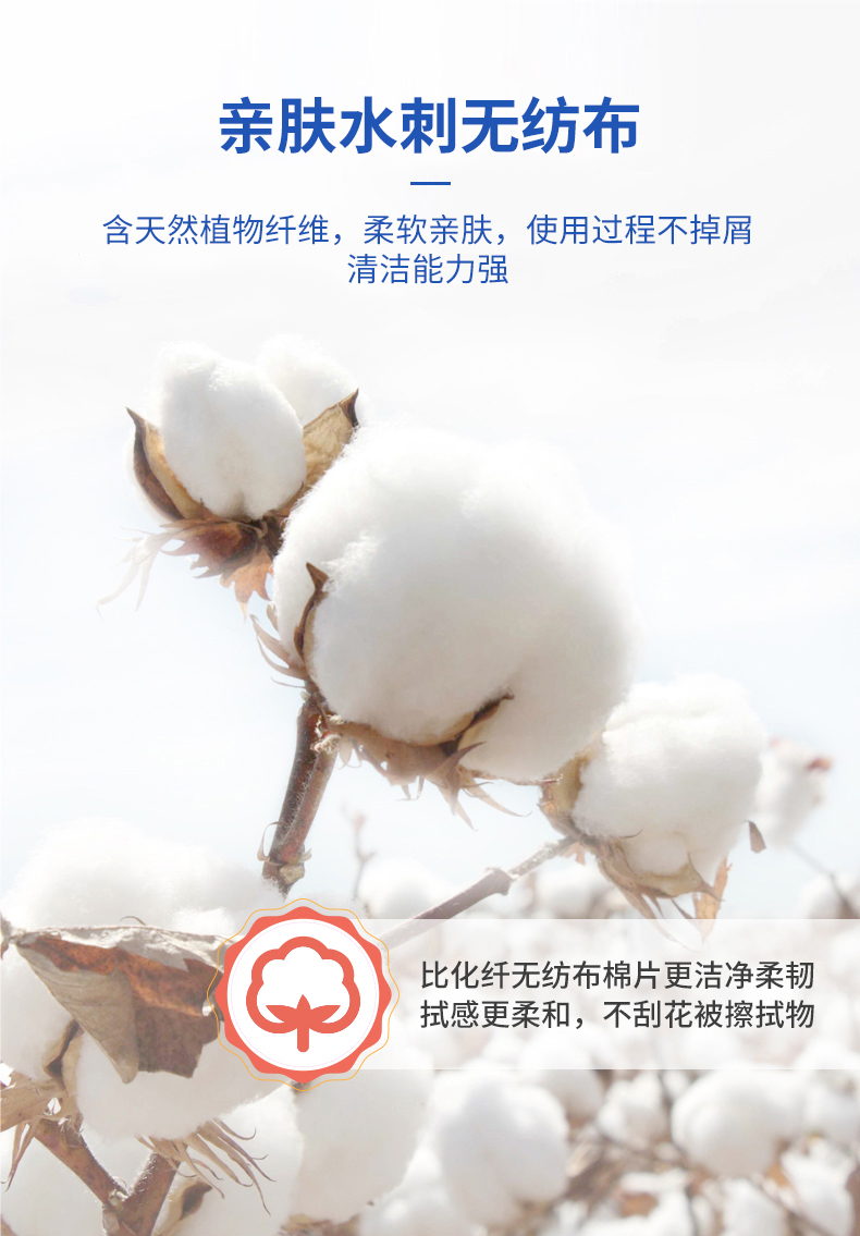产品特点:75%酒精、洗必泰双重除菌;水刺无纺布轻薄韧性好;
